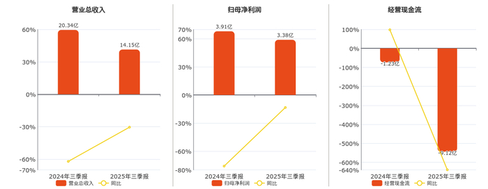 公司营业总收入为14.15亿元,在已披露的同业公司中排名第50,较去年同报告期营业总收入减少6.19亿元,同比较去年同期下降30.46%。归母净利润为3.38亿元,在已披露的同业公司中排名第15,较去年同报告期归母净利润减少5220.19万元,同比较去年同期下降13.36%。经营活动现金净流入为-9.12亿元,在已披露的同业公司中排名第78,较去年同报告期经营活动现金净流入减少7.88亿元。