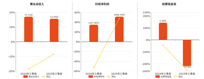 公司营业总收入为12.93亿元,在已披露的同业公司中排名第4。归母净利润为1958.49万元,在已披露的同业公司中排名第5,较去年同报告期归母净利润增加630.68万元,同比较去年同期上涨47.50%。经营活动现金净流入为-2.53亿元。