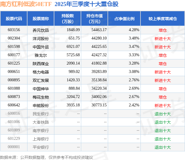 根据2025基金Q3季报公募基金重仓股数据,重仓该股的公募基金共9家,其中持有数量最多的公募基金为南方基金的南方红利低波50ETF。南方红利低波50ETF目前规模为127.39亿元,最新净值1.3952(12月30日),较上一交易日下跌0.24%,近一年上涨1.64%。该公募基金现任基金经理为崔蕾。崔蕾在任的基金产品包括:南方中证申万有色金属ETF发起联接A,管理时间为2019年7月12日至今,期间收益率为187.62%;南方中证1000ETF,管理时间为2019年7月12日至今,期间收益率为80.59%;南方中证申万有色金属ETF,管理时间为2019年7月12日至今,期间收益率为199.42%;