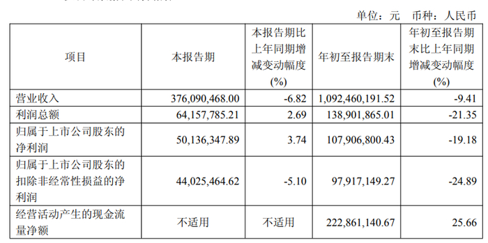 其中第三季度,中源协和营业收入为3.76亿元,同比下降6.82%;归母净利润为5013.63万元,同比增长3.74%;扣非归母净利润为4402.55万元,同比下降5.10%;基本每股收益0.11元。