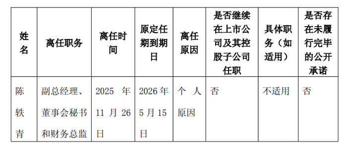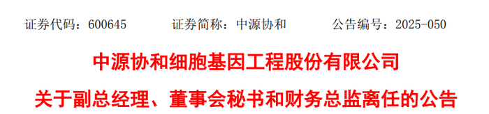 公告显示,中源协和董事会于11月26日收到陈轶青书面辞呈,其因个人原因辞去副总经理、董事会秘书和财务总监职务,辞职后不再担任公司及其控股子公司任何职务,辞呈自送达董事会之日起生效。陈轶青原定任期到2026年5月15日,此次提前离任无未履行完毕的公开承诺。