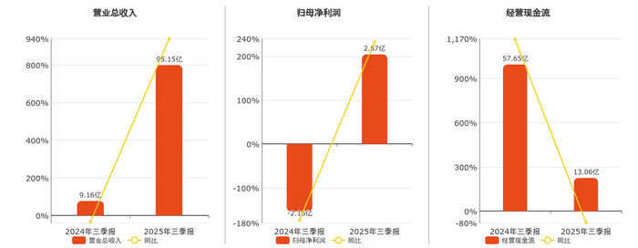 公司营业总收入为95.15亿元,在已披露的同业公司中排名第18,较去年同报告期营业总收入增加85.99亿元,同比较去年同期上涨938.80%。归母净利润为2.87亿元,在已披露的同业公司中排名第17,较去年同报告期归母净利润增加5.03亿元。经营活动现金净流入为13.06亿元,在已披露的同业公司中排名第14。