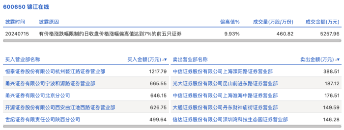 7月15日,锦江在线今日涨停,龙虎榜数据显示,上榜营业部席位全天成交4703.89万元,占当日总成交金额比例为89.46%。其中,买入金额为3655.88万元,卖出金额为1048.01万元,合计净买入2607.87万元。