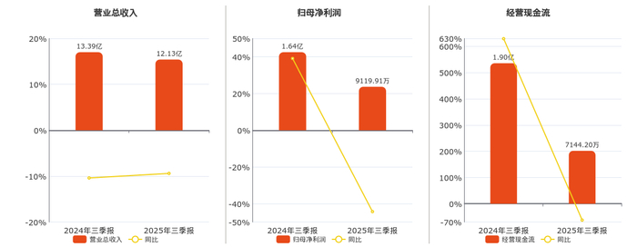 公司营业总收入为12.13亿元,在已披露的同业公司中排名第19,较去年同报告期营业总收入减少1.26亿元,同比较去年同期下降9.40%。归母净利润为9119.91万元,在已披露的同业公司中排名第27,较去年同报告期归母净利润减少7253.36万元,同比较去年同期下降44.30%。经营活动现金净流入为7144.20万元,在已披露的同业公司中排名第28,较去年同报告期经营活动现金净流入减少1.18亿元,同比较去年同期下降62.35%。