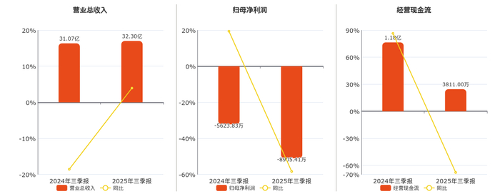 公司营业总收入为32.30亿元,在已披露的同业公司中排名第4,较去年同报告期营业总收入增加1.23亿元,同比较去年同期上涨3.95%。归母净利润为-8905.41万元,在已披露的同业公司中排名第10,较去年同报告期归母净利润减少3281.58万元。经营活动现金净流入为3811.00万元,在已披露的同业公司中排名第8,较去年同报告期经营活动现金净流入减少8035.38万元,同比较去年同期下降67.83%。
