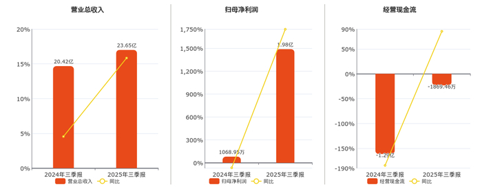 公司营业总收入为23.65亿元。归母净利润为1.98亿元。经营活动现金净流入为-1869.46万元。