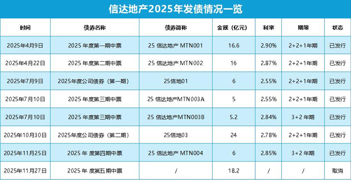 其中,4月9日,信达地产2025年度第一期中票成功发行,金额16.6亿元,利率为2.9%,期限为2+2+1年;两周之后,16亿元中票再度上市,利率为2.87%。