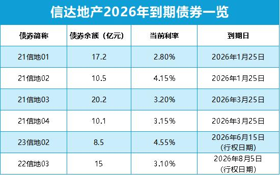 其中包括1月25日到期的“21信地01”及“21信地02”,距离债券偿还剩18天,两笔债券余额分别为17.2亿元、10.5亿元。其次,“21信地03”及“21信地04”将在77天之后面临到期兑付,涉及金额30.3亿元。