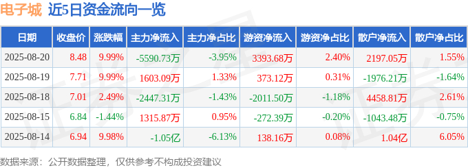 8月20日的资金流向数据方面,主力资金净流出5590.73万元,占总成交额3.95%,游资资金净流入3393.68万元,占总成交额2.4%,散户资金净流入2197.05万元,占总成交额1.55%。