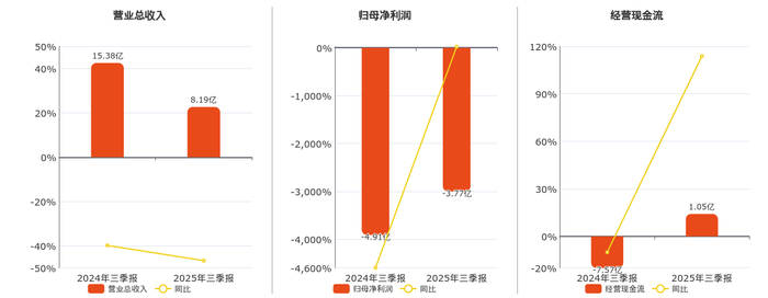 公司营业总收入为8.19亿元。归母净利润为-3.77亿元,较去年同报告期归母净利润增加1.14亿元。经营活动现金净流入为1.05亿元,在已披露的同业公司中排名第42,较去年同报告期经营活动现金净流入增加8.61亿元。