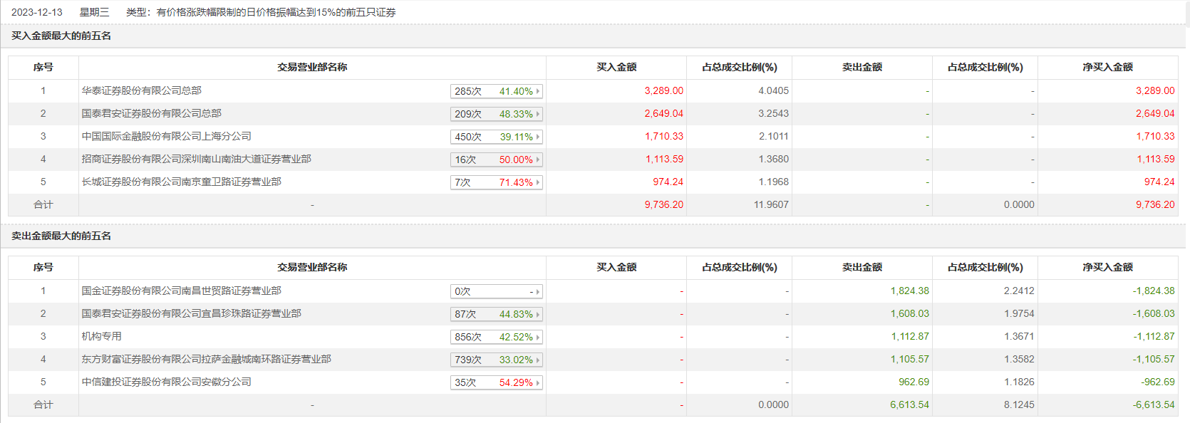 12月13日,昂立教育今日涨6.65%,全天换手率达21.64%,振幅达14.68%。龙虎榜数据显示,营业部席位合计净买入3122.66万元。其中,机构合计净卖出1112.87万元。此外,华泰证券总部、国泰君安证券总部分别买入3289.00万元、2649.04万元;国金证券南昌世贸路证券营业部、国泰君安证券宜昌珍珠路证券营业部分别卖出1824.38万元、1608.03万元。