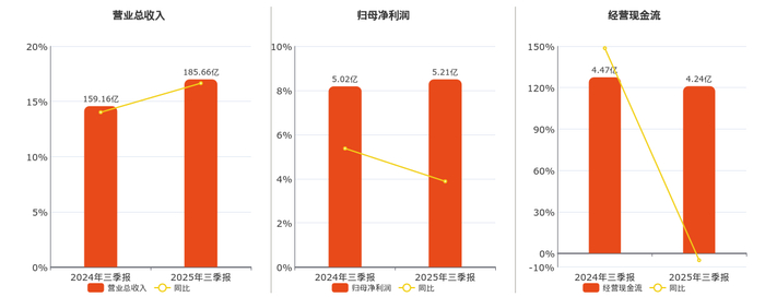 公司营业总收入为185.66亿元,较去年同报告期营业总收入增加26.50亿元,实现4年连续上涨,同比较去年同期上涨16.65%。归母净利润为5.21亿元,较去年同报告期归母净利润增加1944.45万元,实现5年连续上涨,同比较去年同期上涨3.88%。经营活动现金净流入为4.24亿元。