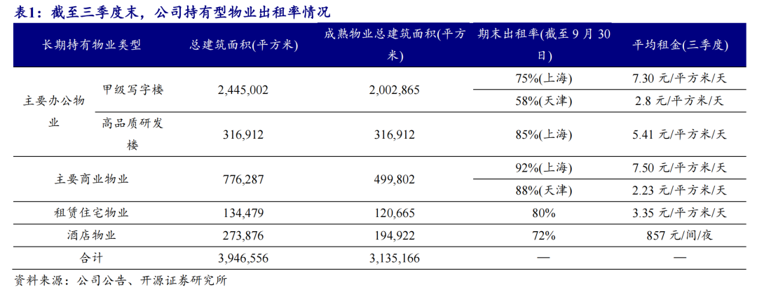 截至2025年三季度末,公司长期持有物业总建筑面积394.66万平方米,成熟物业总建筑面积313.52万平方米,规模同比有所扩大。分类别来看,甲级办公楼上海平均出租率75%(2024年同期83%),天津平均出租率58%(2024年同期65%),同比有所下降;高品质研发楼上海平均出租率85%(2024年同期86%);主要商业物业上海平均出租率92%(2024年同期90%);天津平均出租率88%(2024年同期76%);租赁住宅物业平均出租率80%(2024年同期89%),酒店物业平均出租率72%(2024年同期76%)。