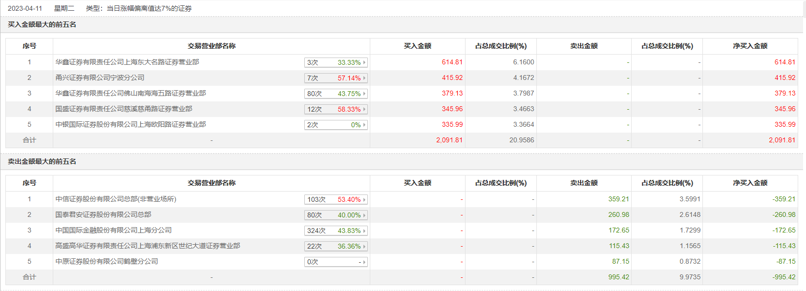 具体来看,华鑫证券上海东大名路证券营业部、甬兴证券有限公司宁波分公司分别买入614.81万元、415.92万元;中信证券总部(非营业场所)、国泰君安证券总部分别卖出359.21万元、260.98万元。