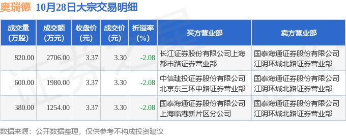 证券之星消息,10月28日奥瑞德发生大宗交易,交易数据如下: