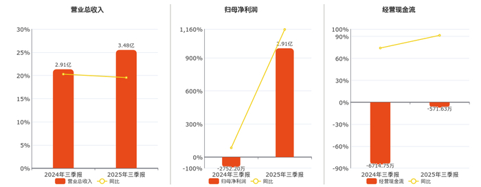 公司营业总收入为3.48亿元,较去年同报告期营业总收入增加5684.69万元,实现2年连续上涨,同比较去年同期上涨19.54%。归母净利润为2.91亿元,在已披露的同业公司中排名第7,较去年同报告期归母净利润增加3.18亿元,实现3年连续上涨。经营活动现金净流入为-571.63万元,较去年同报告期经营活动现金净流入增加6143.12万元,实现2年连续上涨。