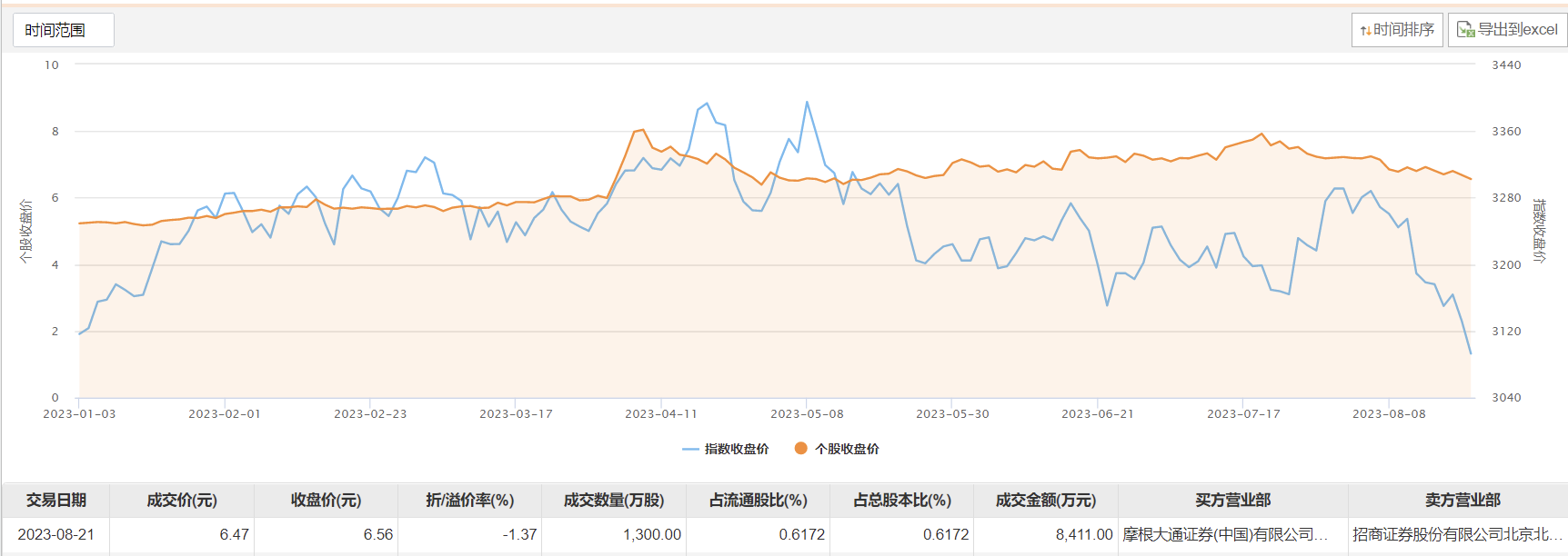8月21日大宗交易成交1300万股,成交额8411万元,占当日总成交额的36.97%,成交价6.47元,较市场收盘价6.56元折价1.37%。