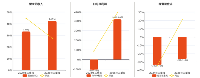 公司营业总收入为1.59亿元,较去年同报告期营业总收入增加3426.00万元,实现3年连续上涨,同比较去年同期上涨27.48%。归母净利润为1420.88万元,较去年同报告期归母净利润增加1790.43万元,实现3年连续上涨。经营活动现金净流入为-3083.11万元,较去年同报告期经营活动现金净流入增加812.60万元。