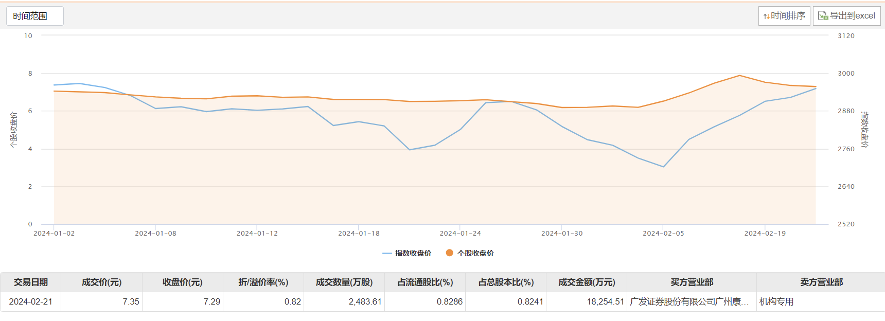 今日大宗交易成交2483.61万股,成交额1.83亿元,占当日总成交额的58.94%,成交价7.35元,较市场收盘价7.29元溢价0.82%。