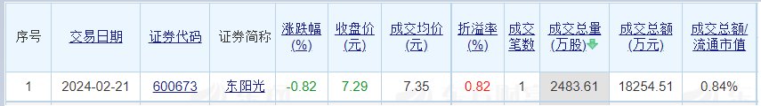 东阳光昨日大宗交易成交2483.61万股 成交额1.83亿元