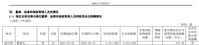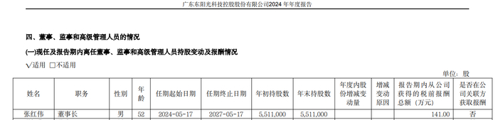 据东阳光2023年及2024年年报,东阳光董事长张红伟2024年薪酬为141万元,相较上年薪酬137.42万元微涨。