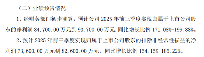 公告显示,2025年1月1日至9月30日,东阳光预计实现归属于上市公司股东的净利润8.47亿元到9.37亿元,同比增长比例171.08% - 199.88%;预计实现归属于上市公司股东的扣除非经常性损益的净利润7.36亿元到8.26亿元,同比增长比例154.15% - 185.22%。