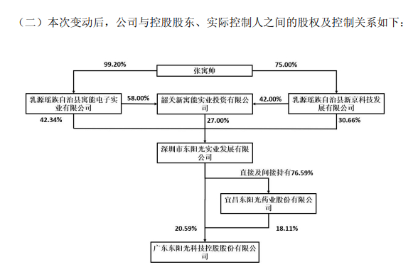 股权比例调整后,郭梅兰不再持有乳源寓能电子和乳源新京科技的股权,不再间接持有东阳光的股份;张寓帅将通过乳源寓能电子和乳源新京科技间接持有东阳光集团100%股权,从而间接持有东阳光11.65亿股股份,占上市公司总股本的38.70%。上市公司实际控制人将由张寓帅、郭梅兰变更为张寓帅。