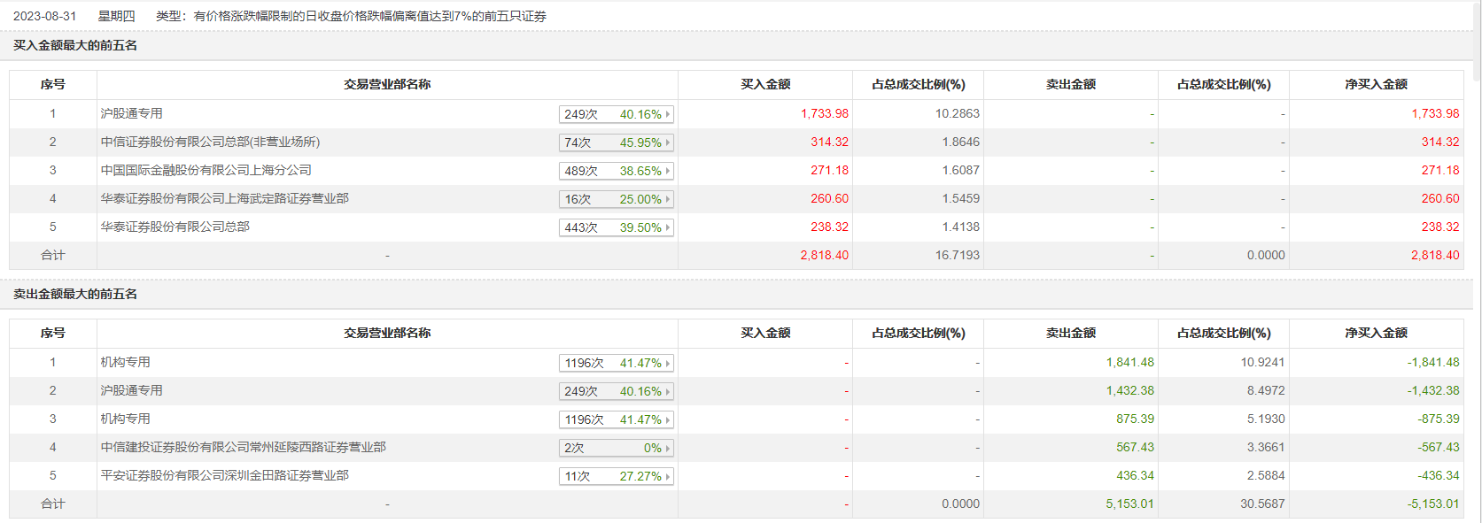 8月31日,中华企业今日跌停,龙虎榜数据显示,上榜营业部席位全天成交7971.41万元,占当日总成交金额比例为47.29%。其中,买入金额为2818.4万元,卖出金额为5153.01万元,合计净卖出2334.61万元。