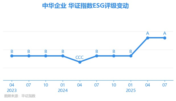 从细项得分来看,中华企业E项得分77.49,评级为BB,行业内排名21/102(E项目评分维度包括气候变化、资源利用、环境友好、环境管理);S项得分87.44,评级为A,行业内排名9/102(S项目评分维度包括人力资本、产品责任、供应商、社会贡献、数据安全与隐私);G项得分85.6,评级为A,行业内排名9/102(G项目评分维度包括股东权益、治理结构、信披质量、治理风险、外部处分、商业道德)。