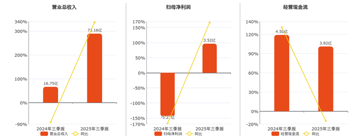 公司营业总收入为73.16亿元,在已披露的同业公司中排名第19,较去年同报告期营业总收入增加56.41亿元,同比较去年同期上涨336.81%。归母净利润为3.52亿元,在已披露的同业公司中排名第14,较去年同报告期归母净利润增加8.79亿元。经营活动现金净流入为3.82亿元,在已披露的同业公司中排名第28。