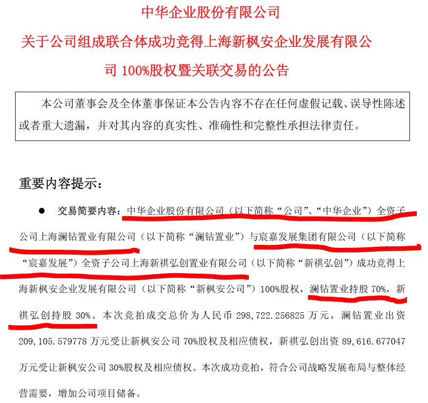 2025年9月25日,中华企业联合宸嘉发展以29.87亿元收购上海新枫安公司100%股权,正式入局徐汇东安旧改核心地块开发。