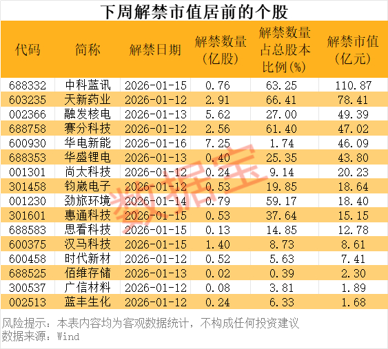 下周(1月12日至16日),6股解禁市值均超40亿元。