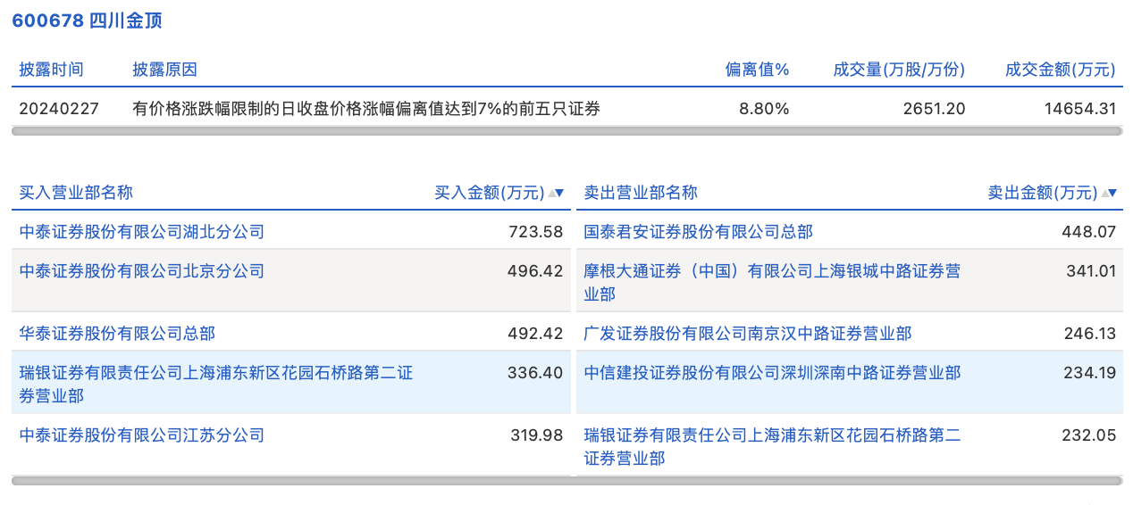 2月27日,四川金顶今日涨停,龙虎榜数据显示,上榜营业部席位全天成交3870.25万元,占当日总成交金额比例为26.41%。其中,买入金额为2368.79万元,卖出金额为1501.46万元,合计净买入867.34万元。
