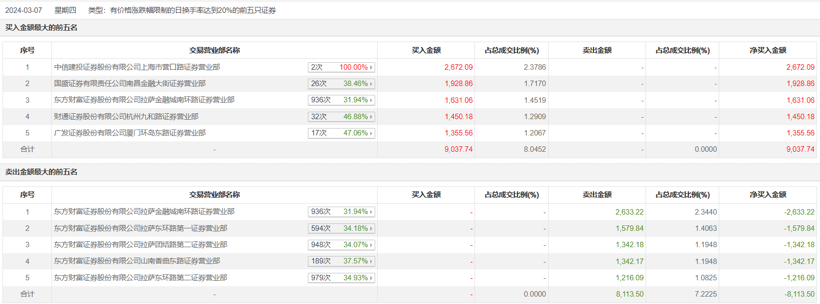 具体来看,中信建投证券上海市营口路证券营业部、国盛证券南昌金融大街证券营业部分别买入2672.09万元、1928.86万元;东方财富证券拉萨金融城南环路证券营业部、东方财富证券拉萨东环路第一证券营业部分别卖出2633.22万元、1579.84万元。