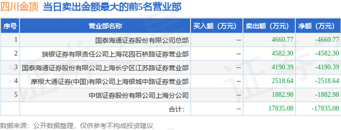 证券之星消息,沪深交易所2026年1月7日公布的交易公开信息显示,四川金顶(600678)因有价格涨跌幅限制的日换手率达到20%的前五只证券登上龙虎榜。此次是近5个交易日内第4次上榜。