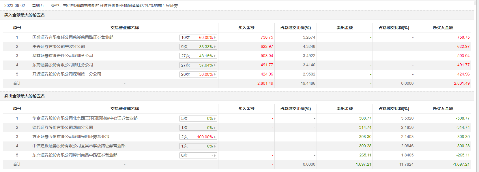 具体来看,国盛证券慈溪慈甬路证券营业部、甬兴证券有限公司宁波分公司分别买入758.75万元、622.97万元;华泰证券北京西三环国际财经中心证券营业部、德邦证券湖南分公司分别卖出508.77万元、314.74万元。