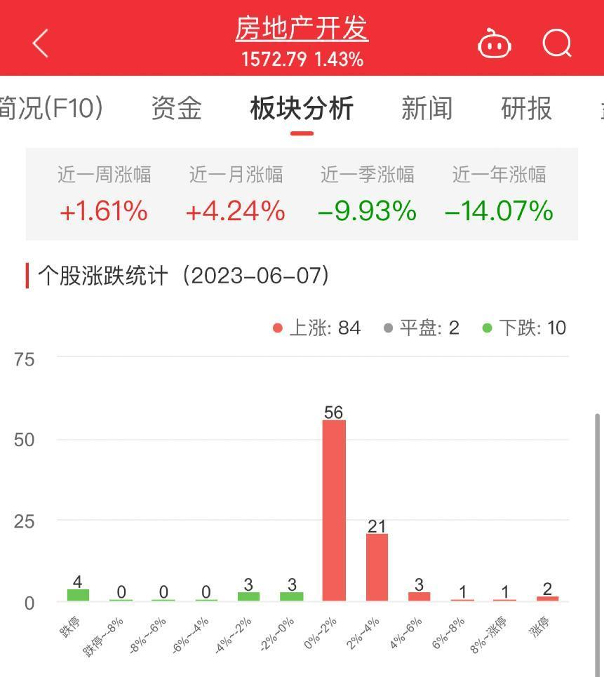 中国经济网北京6月7日讯 今日,房地产开发板块整体涨幅1.43%,其中84只股票上涨,2只股票平盘,10只股票下跌。
