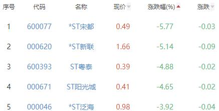 *ST宋都、*ST新联、ST粤泰、ST阳光城、*ST泛海位列涨幅榜后五位,涨幅分别为-5.77%、-5.14%、-4.88%、-4.65%、-3.92%。
