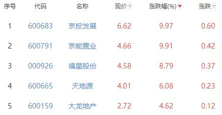 其中,京投发展、京能置业、福星股份、天地源、大龙地产位列板块涨幅前五位,涨幅分别为9.97%、9.91%、8.79%、6.08%、4.62%。