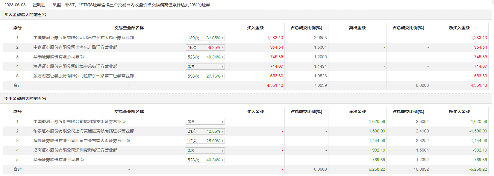 具体来看,中国银河证券北京中关村大街证券营业部、中泰证券上海东方路证券营业部分别买入1283.13万元、954.54万元;中国银河证券杭州双龙街证券营业部、华泰证券上海黄浦区黄陂南路证券营业部分别卖出1620.58万元、1500.99万元。