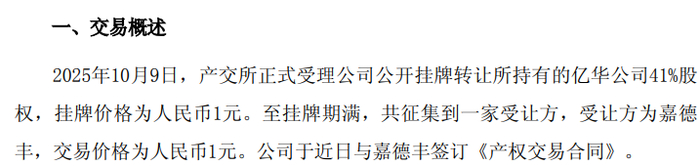 2025年10月9日,产交所正式受理公司公开挂牌转让亿华公司41%股权,挂牌价格为1元。挂牌期满,征集到一家受让方,即广东嘉德丰投资发展有限公司,交易价格为1元。近日,公司与嘉德丰签订《产权交易合同》。