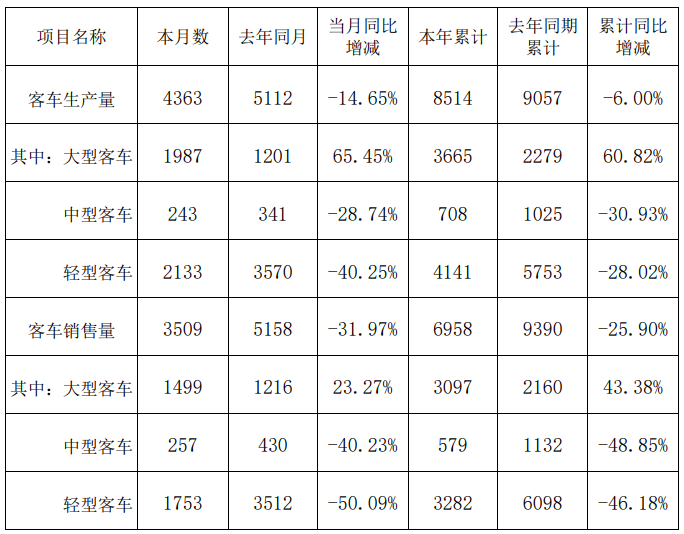4月7日公告,3月份客车销售量为3509辆,同比下降31.97%;本年累计销售量为6958辆,同比下降25.90%。