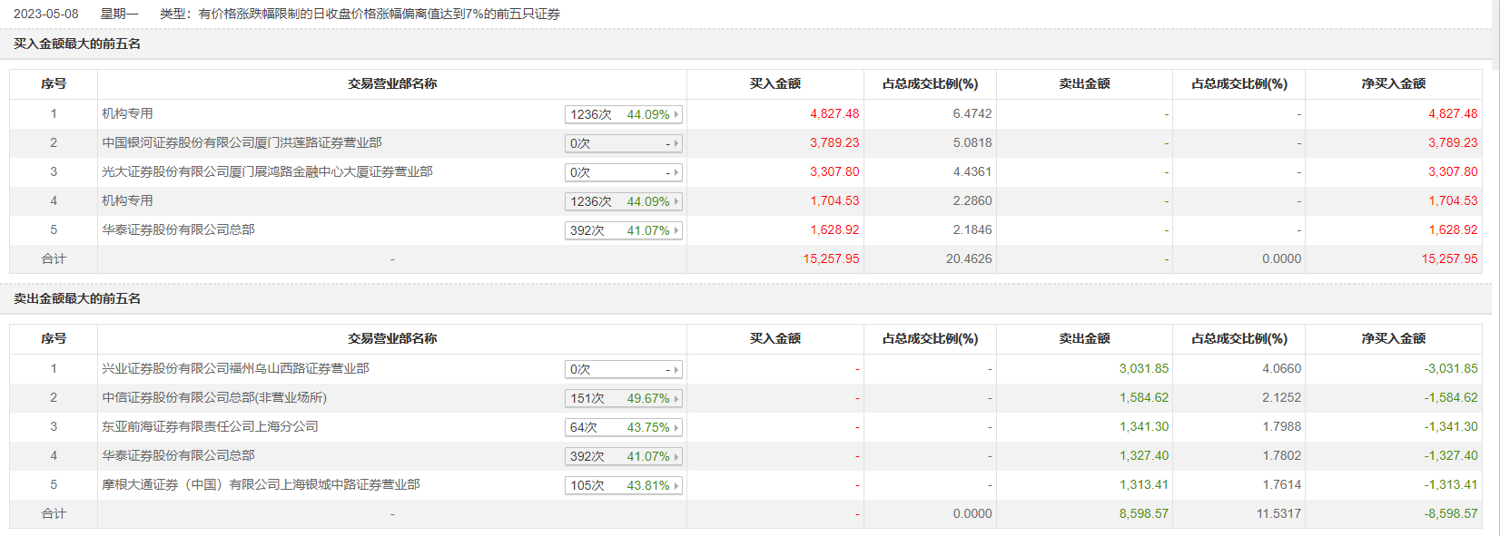 具体来看,机构合计净买入6532.01万元。此外,中国银河证券厦门洪莲路证券营业部、光大证券厦门展鸿路金融中心大厦证券营业部分别买入3789.23万元、3307.80万元;兴业证券福州乌山西路证券营业部、中信证券总部(非营业场所)分别卖出3031.85万元、1584.62万元。