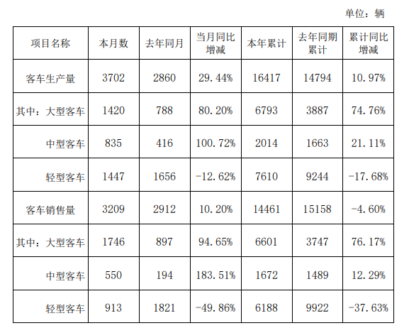金龙汽车:前5月客车累计销量14461辆,同比下降4.6%