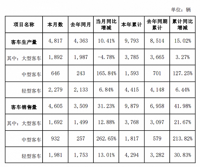 4月8日公告,3月客车销售量4605辆,同比增长31.23%;本年累计销售量9879辆,同比增长41.98%。