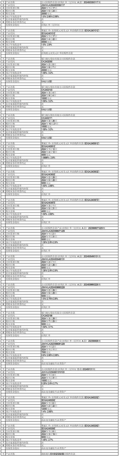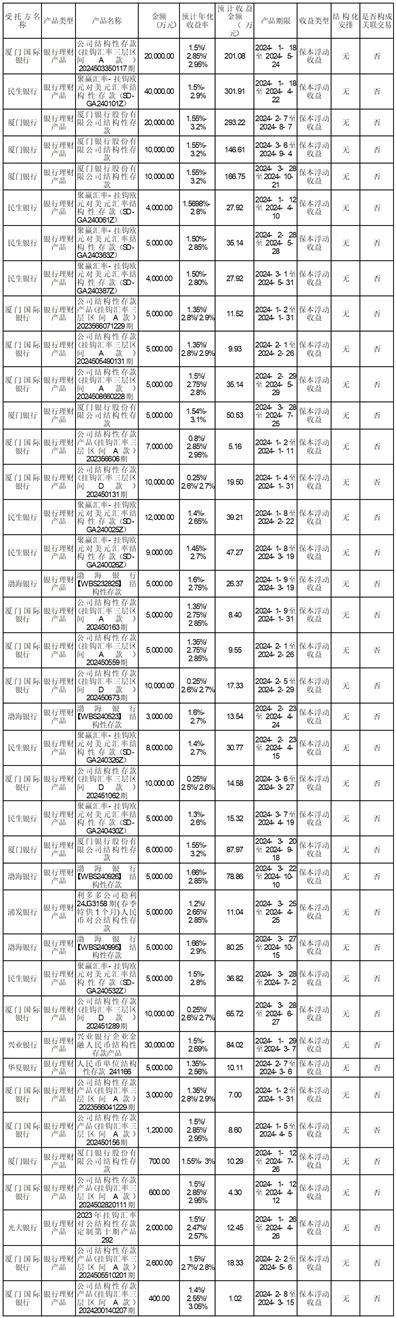 ● 委托理财产品名称:公司结构性存款(挂钩汇率三层区间 A款) 2024503350117期、聚赢汇率-挂钩欧元对美元汇率结构性存款(SDGA240101Z)、厦门银行股份有限公司结构性存款、聚赢汇率-挂钩欧元对美元汇率结构性存款(SDGA240061Z)、聚赢汇率-挂钩欧元对美元汇率结构性存款(SDGA240363Z)、聚赢汇率-挂钩欧元对美元汇率结构性存款(SDGA240387Z)、公司结构性存款产品(挂钩汇率三层区间 A款) 2023566071229期、公司结构性存款(挂钩汇率三层区间 A款) 2024505490131期、公司结构性存款(挂钩汇率三层区间 A款) 2024508660228期、公司结构性存款产品(挂钩汇率三层区间 A款) 202356606期、公司结构性存款(挂钩汇率三层区间 D款)202450131期、聚赢汇率-挂钩欧元对美元汇率结构性存款(SDGA240025Z)、聚赢汇率-挂钩欧元对美元汇率结构性存款(SDGA240026Z)、渤海银行【WBS232825】结构性存款、公司结构性存款(挂钩汇率三层区间 A款) 202450163期、公司结构性存款(挂钩汇率三层区间 A款) 202450559期、公司结构性存款(挂钩汇率三层区间 D款) 202450673期、渤海银行【WBS240523】结构性存款、聚赢汇率-挂钩欧元对美元汇率结构性存款(SDGA240326Z)、公司结构性存款(挂钩汇率三层区间 D款) 202451062期、聚赢汇率-挂钩欧元对美元汇率结构性存款(SDGA240430Z)、渤海银行【WBS240926】结构性存款、利多多公司稳利24JG3158期(春季特供1个月)人民币对公结构性存款、渤海银行【WBS240995】结构性存款、聚赢汇率-挂钩欧元对美元汇率结构性存款(SDGA240532Z)、公司结构性存款(挂钩汇率三层区间 D款) 202451289期、兴业银行企业金融人民币结构性存款产品、人民币单位结构性存款 241166、公司结构性存款产品(挂钩汇率三层区间 A款) 2023566041229期、公司结构性存款产品(挂钩汇率三层区间 A款) 202450156期、公司结构性存款产品(挂钩汇率三层区间 A款) 2024502820111期、2023年挂钩汇率对公结构性存款定制第十期产品292、公司结构性存款产品(挂钩汇率三层区间 A款) 2024505510201期、公司结构性存款产品(挂钩汇率三层区间 A款) 2024200140207期、公司结构性存款产品(挂钩汇率三层区间 A款) 2024510920306期、公司结构性存款产品(挂钩汇率三层区间 A款) 2024200360315期。