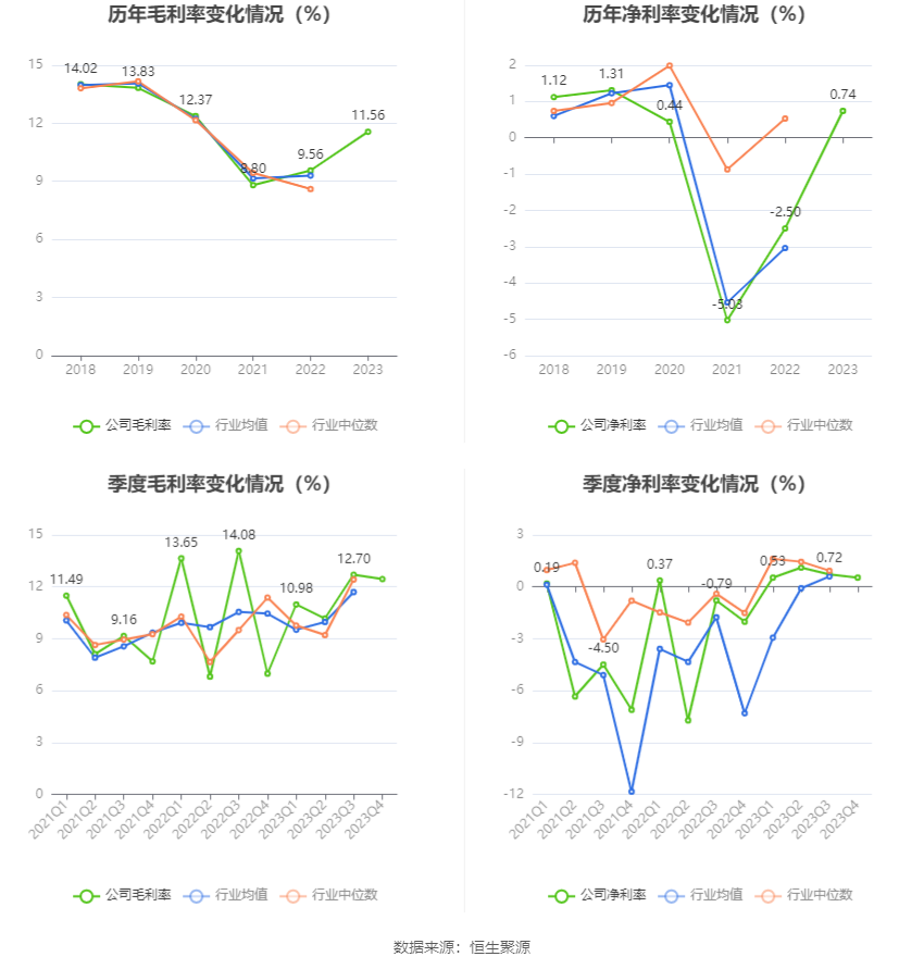 2023年,公司毛利率为11.56%,同比上升2.00个百分点;净利率为0.74%,较上年同期上升3.24个百分点。从单季度指标来看,2023年第四季度公司毛利率为12.45%,同比上升5.47个百分点,环比下降0.25个百分点;净利率为0.53%,较上年同期上升2.55个百分点,较上一季度下降0.19个百分点。
