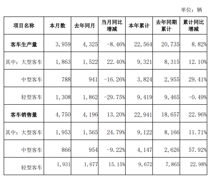 7月4日公告,6月客车销售量4750辆,同比增加13.20%;本年累计客车销售量22941辆,同比增加22.96%。