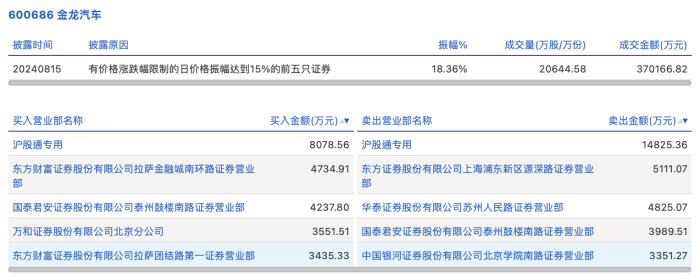 8月15日,金龙汽车今日涨停,龙虎榜数据显示,上榜营业部席位全天成交5.61亿元,占当日总成交金额比例为15.17%。其中,买入金额为2.4亿元,卖出金额为3.21亿元,合计净卖出8064.16万元。
