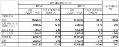 2023年度本集团销售成本为人民币816.13亿元,比上年度的人民币762.66亿元上升了7.01%。主要是原油加工量上涨所致。销售成本占本年度销售净额的102.19%。